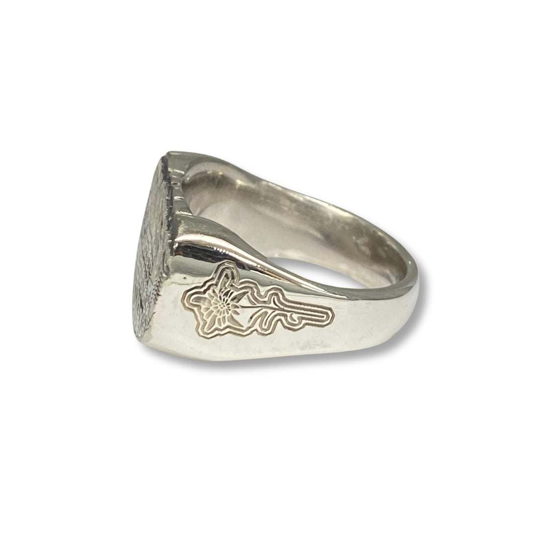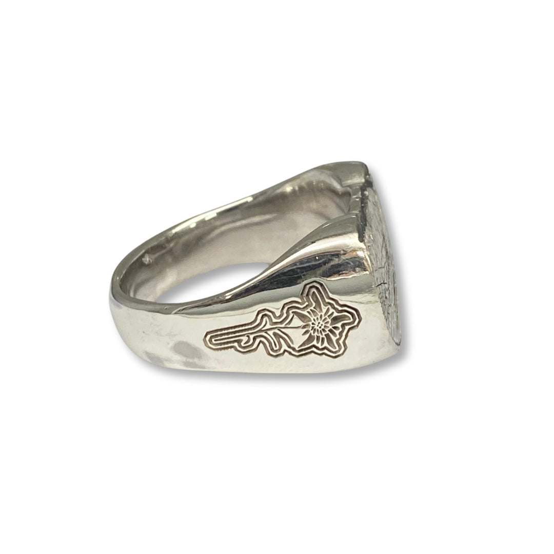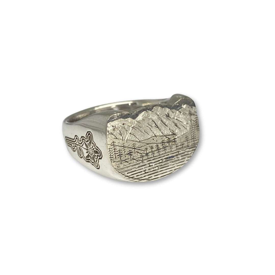 Ring in silver 925 polished with the mountain landscape of St. Moritz on the top, on the both sides engraved with an Edelweiss flower